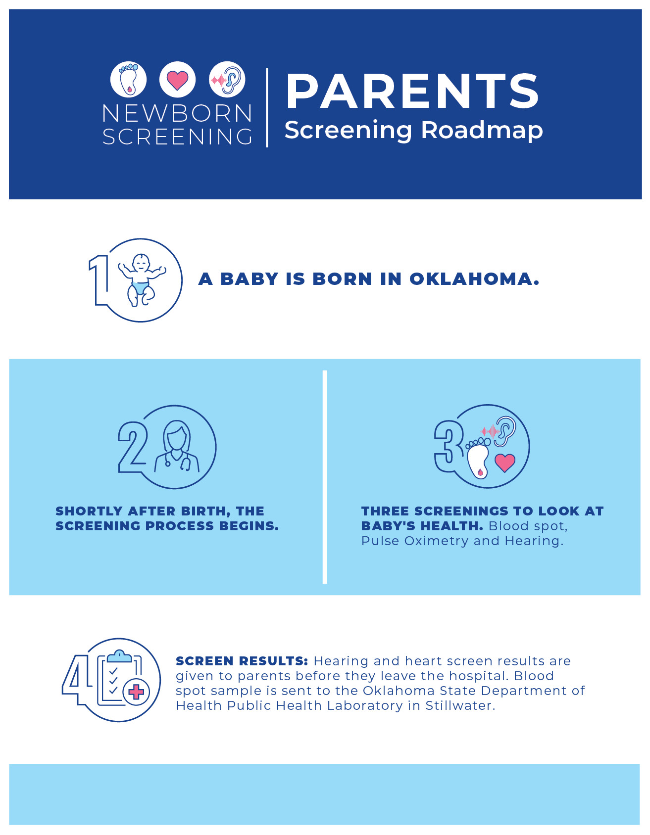 A two-page process roadmap created to help new parents understand Oklahoma’s newborn screening procedures. The original clinical text was dense and difficult for non-medical audiences to interpret.
